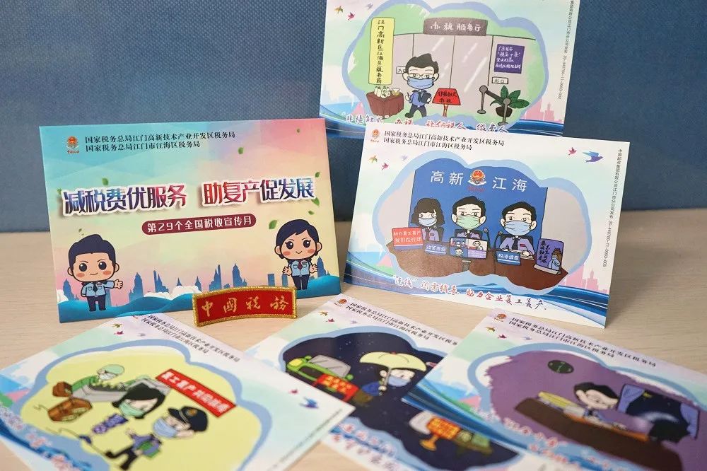 4月,江門高新區(qū)(江海區(qū))稅務(wù)局以身邊稅務(wù)人參與戰(zhàn)“疫”復(fù)產(chǎn)的一幕幕感人畫面為原型,結(jié)合支持復(fù)工復(fù)產(chǎn)稅費(fèi)優(yōu)惠政策、非接觸式辦稅指引等,手繪了一套5張的戰(zhàn)“疫”復(fù)產(chǎn)主題漫畫明信片,通過“走訪+郵寄”的方式送到納稅人手中,創(chuàng)新稅宣活動的載體和形式。