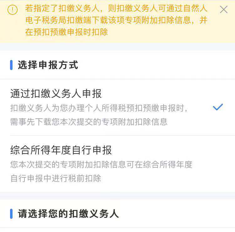 1、選擇單位在當(dāng)年剩余月份發(fā)放工資時(shí)補(bǔ)扣的,勾選“通過扣繳義務(wù)人申報(bào)”;