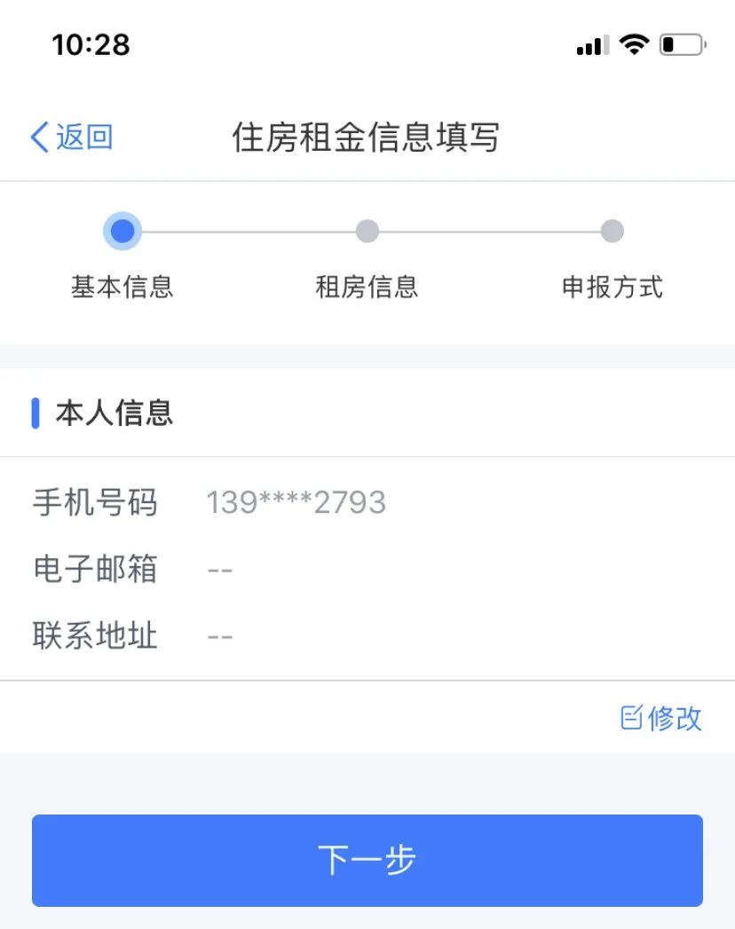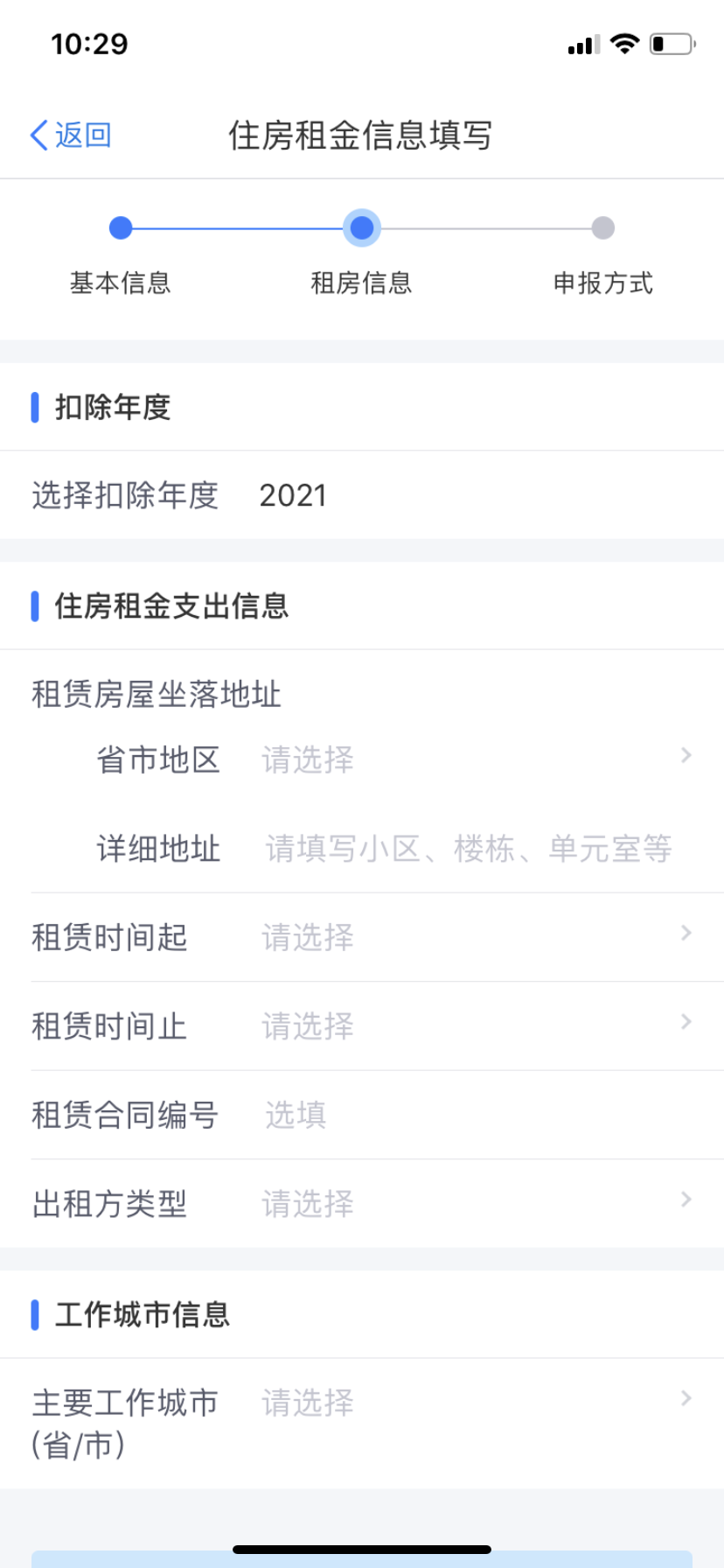 5、填寫“住房租金支出信息”和“工作城市信息”后,點(diǎn)擊“下一步”