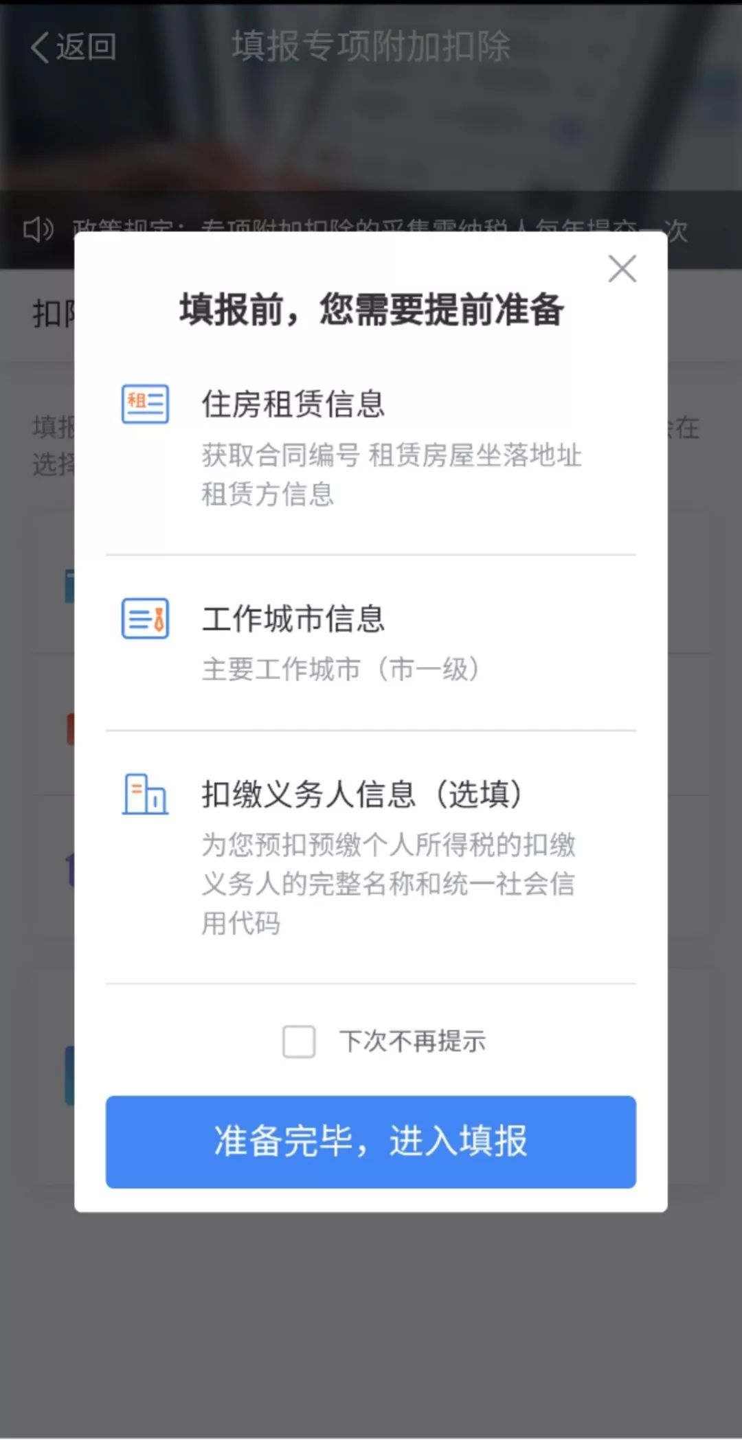 3、確認(rèn)材料完備后,點(diǎn)擊“準(zhǔn)備完畢,進(jìn)入填報”