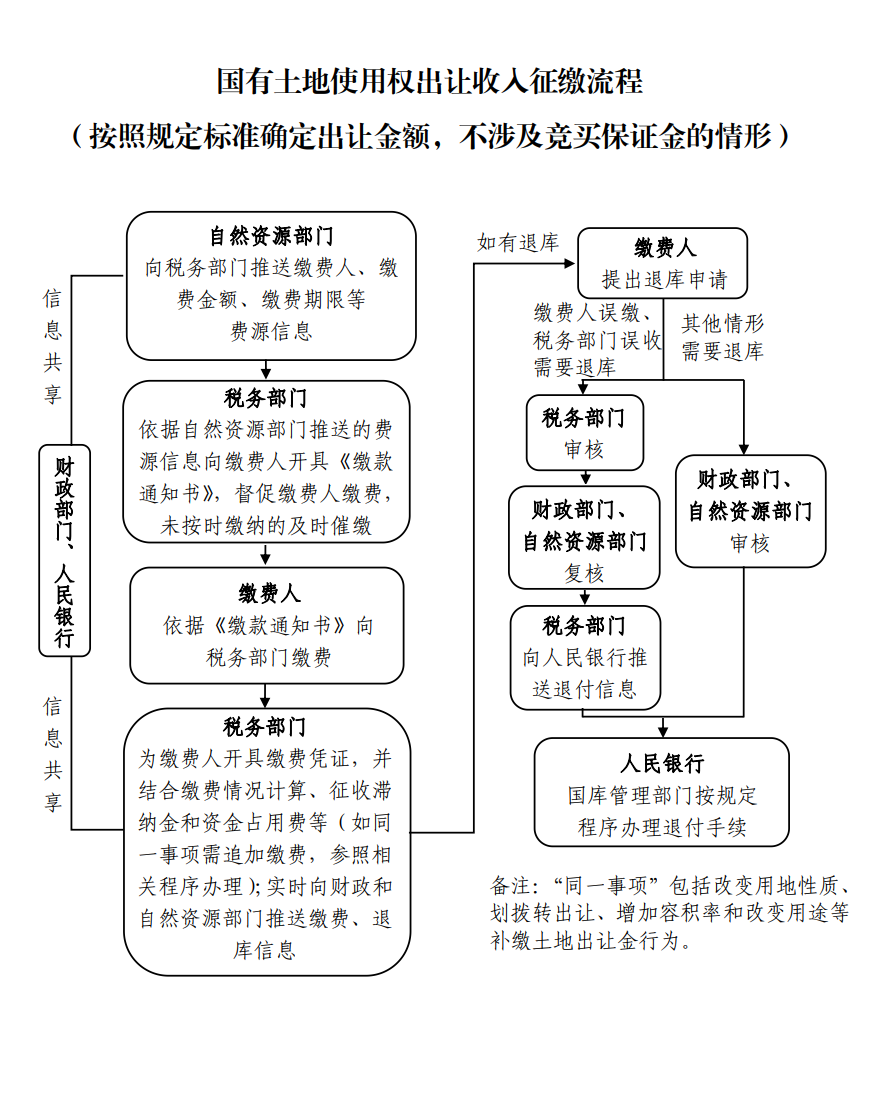 九、自然資源部門與使用權(quán)人簽訂出讓、劃撥等合同后,應(yīng)當(dāng)及時(shí)向稅務(wù)部門和財(cái)政部門傳遞相關(guān)信息,確保征管信息實(shí)時(shí)共享。稅務(wù)部門應(yīng)會(huì)同財(cái)政、自然資源、人民銀行等部門做好業(yè)務(wù)銜接和信息互聯(lián)互通工作,并將計(jì)征、繳款等明細(xì)信息通過互聯(lián)互通系統(tǒng)傳遞給財(cái)政、自然資源、人民銀行等相關(guān)部門,確保征管信息實(shí)時(shí)共享,賬目清晰無誤。同時(shí),向財(cái)政部門報(bào)送征收情況,并附文字說明材料。