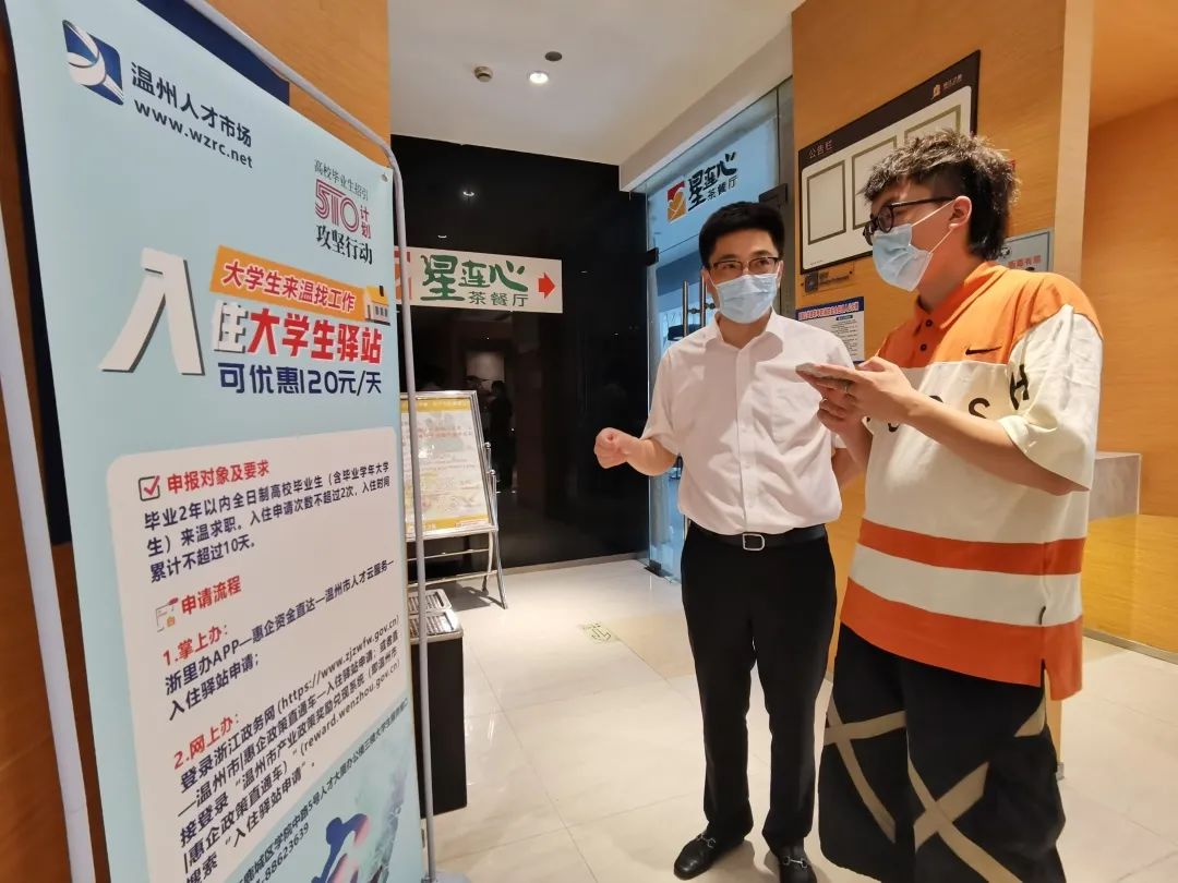 “你是怎么知道人才驛站這項政策的?”“人才驛站申辦的感受怎么樣?”“你覺得驛站的居住環(huán)境還可以嗎?”瞿自杰與小張展開深入交談,還當起了“宣傳員”向小張介紹溫州“510計劃”人才政策,以及大量的優(yōu)質崗位。小張表示,通過手機端就能辦理驛站入住申請非常便利,將連鎖酒店設為大學生驛站也大大提升了居住環(huán)境和安全保障。