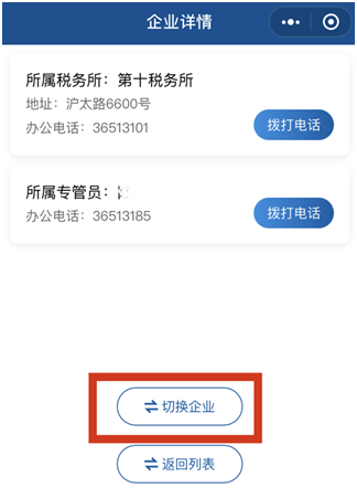 進(jìn)入小程序首頁——點(diǎn)擊上方“我的企業(yè)詳情”進(jìn)入查詢模塊,將顯示該企業(yè)的管理所、專管員及相關(guān)聯(lián)系電話。