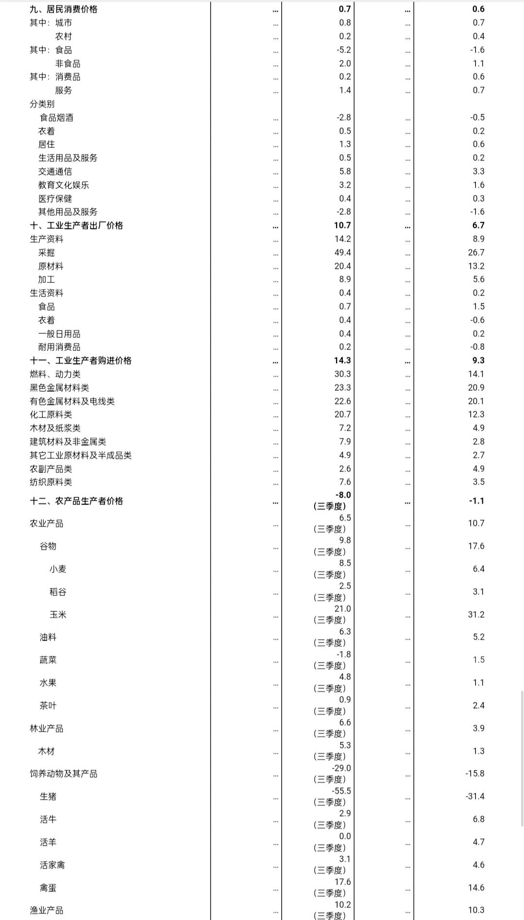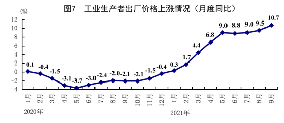 前三季度,全國(guó)工業(yè)生產(chǎn)者出廠價(jià)格同比上漲6.7%,漲幅比上半年擴(kuò)大1.6個(gè)百分點(diǎn);其中9月份同比上漲10.7%,環(huán)比上漲1.2%。前三季度,全國(guó)工業(yè)生產(chǎn)者購(gòu)進(jìn)價(jià)格同比上漲9.3%,漲幅比上半年擴(kuò)大2.2個(gè)百分點(diǎn);其中9月份同比上漲14.3%,環(huán)比上漲1.1%。