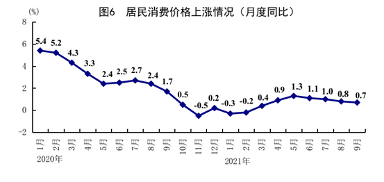 前三季度,全國(guó)居民消費(fèi)價(jià)格(CPI)同比上漲0.6%,漲幅比上半年擴(kuò)大0.1個(gè)百分點(diǎn)。其中,9月份全國(guó)居民消費(fèi)價(jià)格同比上漲0.7%,漲幅比上月回落0.1個(gè)百分點(diǎn);環(huán)比持平。