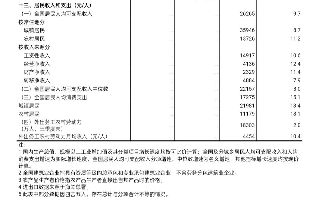 (9)全國(guó)居民人均可支配收入中位數(shù)是指將所有調(diào)查戶按人均可支配收入水平從低到高順序排列,處于最中間位置的調(diào)查戶的人均可支配收入。
