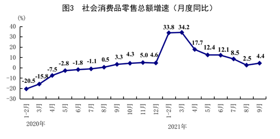 前三季度,社會(huì)消費(fèi)品零售總額318057億元,同比增長(zhǎng)16.4%,兩年平均增長(zhǎng)3.9%。9月份,社會(huì)消費(fèi)品零售總額36833億元,同比增長(zhǎng)4.4%,比上月加快1.9個(gè)百分點(diǎn);兩年平均增長(zhǎng)3.8%,加快2.3個(gè)百分點(diǎn);環(huán)比增長(zhǎng)0.30%。