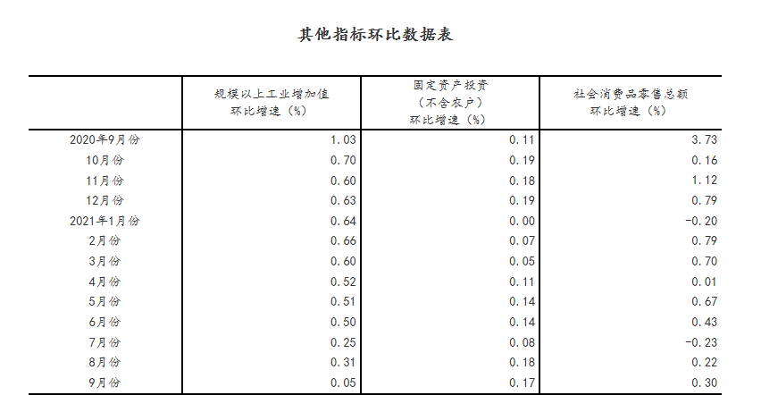 (3)根據(jù)季節(jié)調(diào)整模型自動(dòng)修正結(jié)果,對(duì)近一年來(lái)各期國(guó)內(nèi)生產(chǎn)總值、規(guī)模以上工業(yè)增加值、固定資產(chǎn)投資(不含農(nóng)戶)、社會(huì)消費(fèi)品零售總額環(huán)比增速進(jìn)行修訂。修訂結(jié)果及2021年三季度GDP環(huán)比數(shù)據(jù)、2021年9月份其他指標(biāo)環(huán)比數(shù)據(jù)如下: