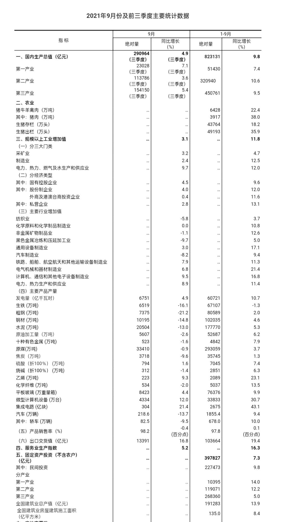 第一,主要宏觀指標(biāo)保持在合理區(qū)間,經(jīng)濟(jì)恢復(fù)態(tài)勢(shì)持續(xù)。一是經(jīng)濟(jì)持續(xù)增長(zhǎng)。受上年同期基數(shù)抬升影響,以及疫情汛情的沖擊,前三季度經(jīng)濟(jì)同比增速比上半年有所回落,但環(huán)比延續(xù)擴(kuò)張勢(shì)頭,兩年平均增速仍保持較快增長(zhǎng)。前三季度,國(guó)內(nèi)生產(chǎn)總值同比增長(zhǎng)9.8%,高于6%以上的預(yù)期目標(biāo)。其中,三季度同比增長(zhǎng)4.9%,環(huán)比增長(zhǎng)0.2%,兩年平均增長(zhǎng)4.9%。 二是就業(yè)基本穩(wěn)定。經(jīng)濟(jì)持續(xù)恢復(fù),就業(yè)優(yōu)先政策顯效,就業(yè)規(guī)模擴(kuò)大,重點(diǎn)群體就業(yè)得到保障。前三季度,城鎮(zhèn)新增就業(yè)1045萬(wàn)人,完成全年目標(biāo)任務(wù)的95%;城鎮(zhèn)調(diào)查失業(yè)率均值為5.2%,低于全年5.5%左右的預(yù)期目標(biāo)。三季度末,外出務(wù)工農(nóng)村勞動(dòng)力18303萬(wàn)人,同比增長(zhǎng)2%,規(guī)?;净謴?fù)至疫情前同期水平。三是消費(fèi)價(jià)格漲勢(shì)溫和。農(nóng)業(yè)生產(chǎn)形勢(shì)較好,生豬產(chǎn)能恢復(fù),工業(yè)服務(wù)業(yè)生產(chǎn)增加,重要民生產(chǎn)品供給充足,居民消費(fèi)價(jià)格保持穩(wěn)定。前三季度,居民消費(fèi)價(jià)格同比上漲0.6%,低于3%左右的預(yù)期目標(biāo)。四是國(guó)際收支繼續(xù)改善。從貨物貿(mào)易看,前三季度貨物貿(mào)易進(jìn)出口順差同比擴(kuò)大23.7%。從服務(wù)貿(mào)易看,我國(guó)旅行服務(wù)進(jìn)口減少,現(xiàn)代服務(wù)出口增長(zhǎng)。1-8月份服務(wù)進(jìn)出口逆差同比收窄66.7%。9月末,我國(guó)外匯儲(chǔ)備余額32006億美元,連續(xù)5個(gè)月保持在3萬(wàn)億美元以上。