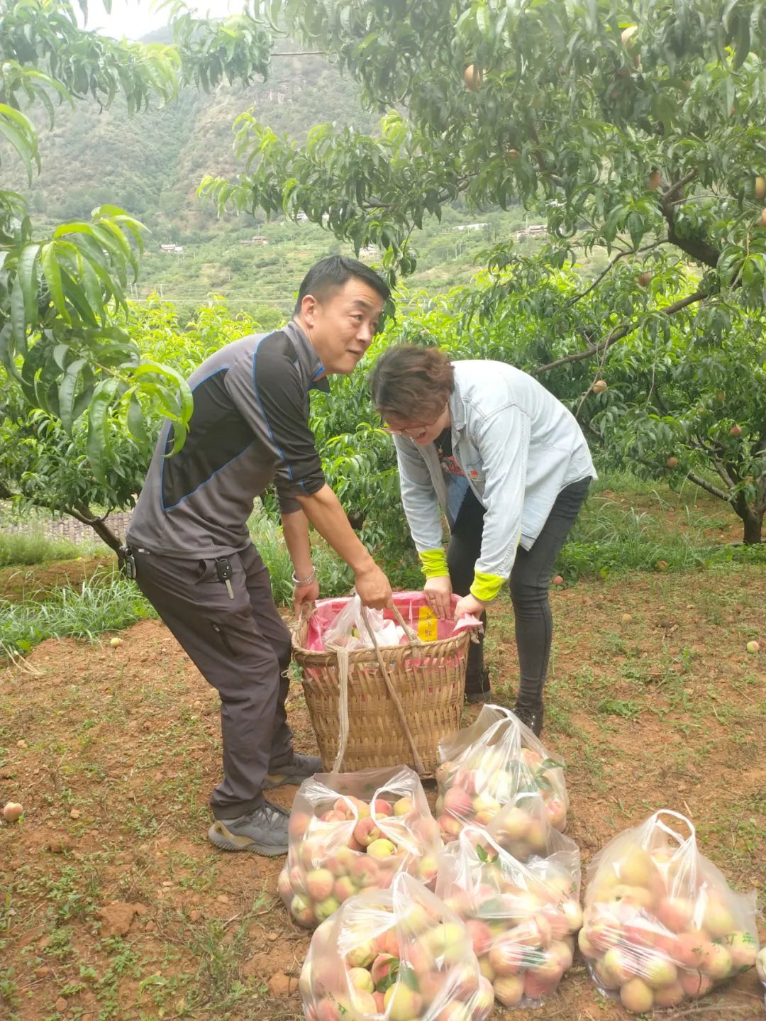 老同志是干活的一把好手,他們不僅熟練的摘桃,還熱情和年輕同志分享經(jīng)驗。年輕男同志身手矯健,爬到樹上采摘高處的桃子。女同志們也不甘落后,有的專門負責低處成熟了的桃子,有的兩人合作,干勁滿滿。和紹賢本人也激動的背上籮筐和同志們一起勞動。